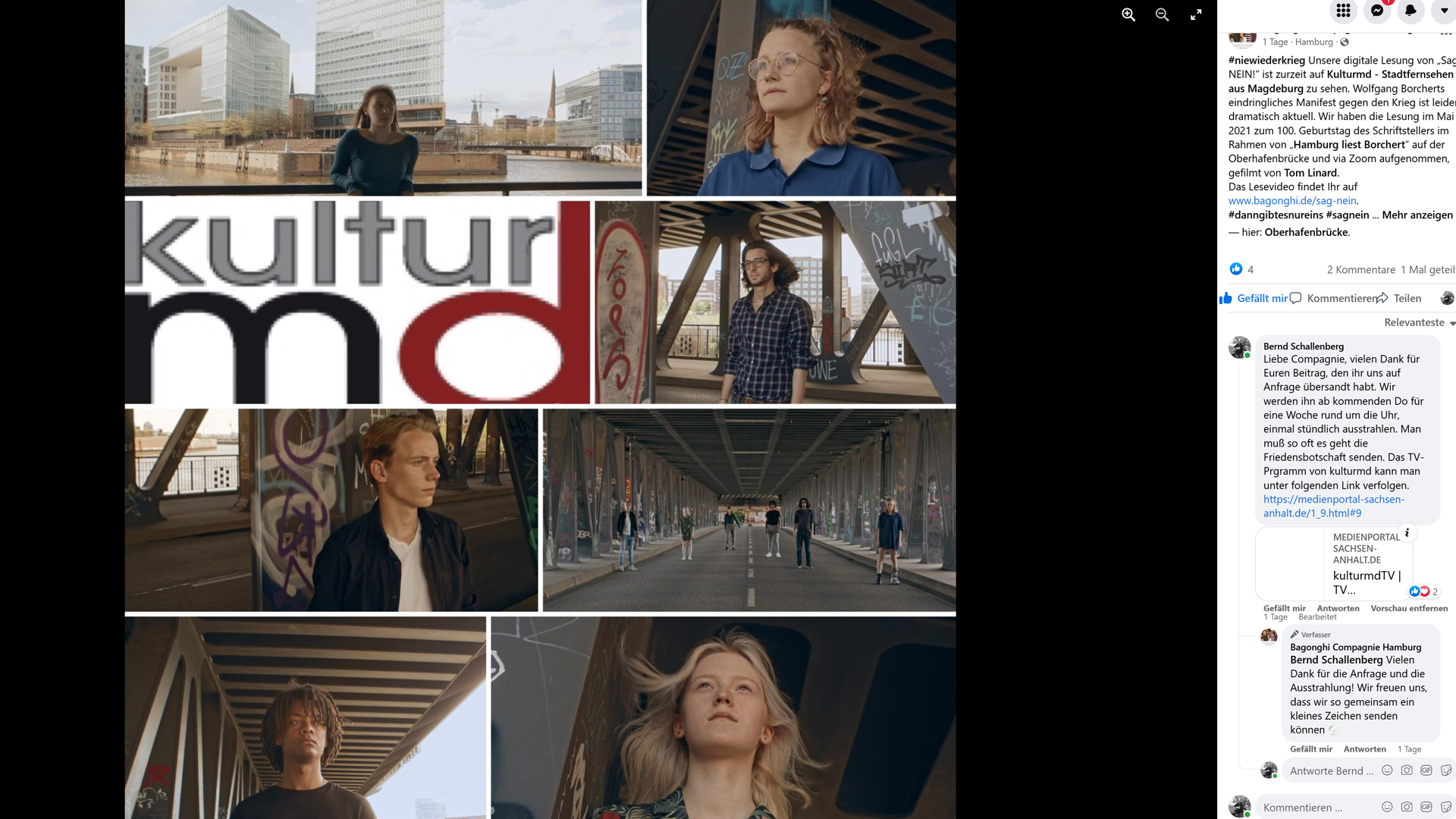 Wir sind auf der Suche nach passenden Aussagen auf die Campagnie Hamburg gestossen. Diese setzte das Gedicht Sag nein! von Wolfgang Borchert in einer digitalen Lesung um. Wir haben angefragt, ob wir es senden dürfen. Die Zusage kam sofort.